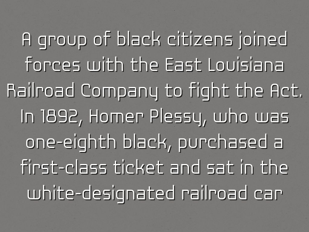 A group of black citizens joined forces with the East Louisiana Railroad Company to fight the Act. In 1892, Homer Plessy, who was one-eighth black, purchased a first-class ticket and sat in the white-designated railroad car