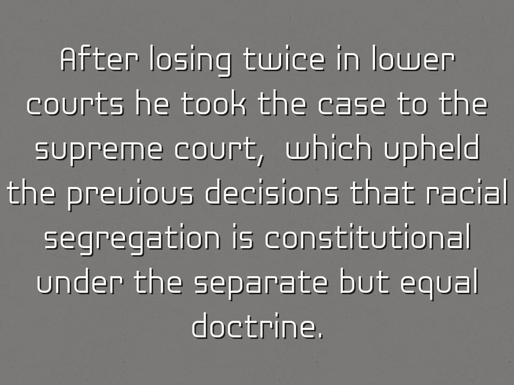 After losing twice in lower courts he took the case to the supreme court, which upheld the previous decisions that racial segregation is constitutional under the separate but equal doctrine.