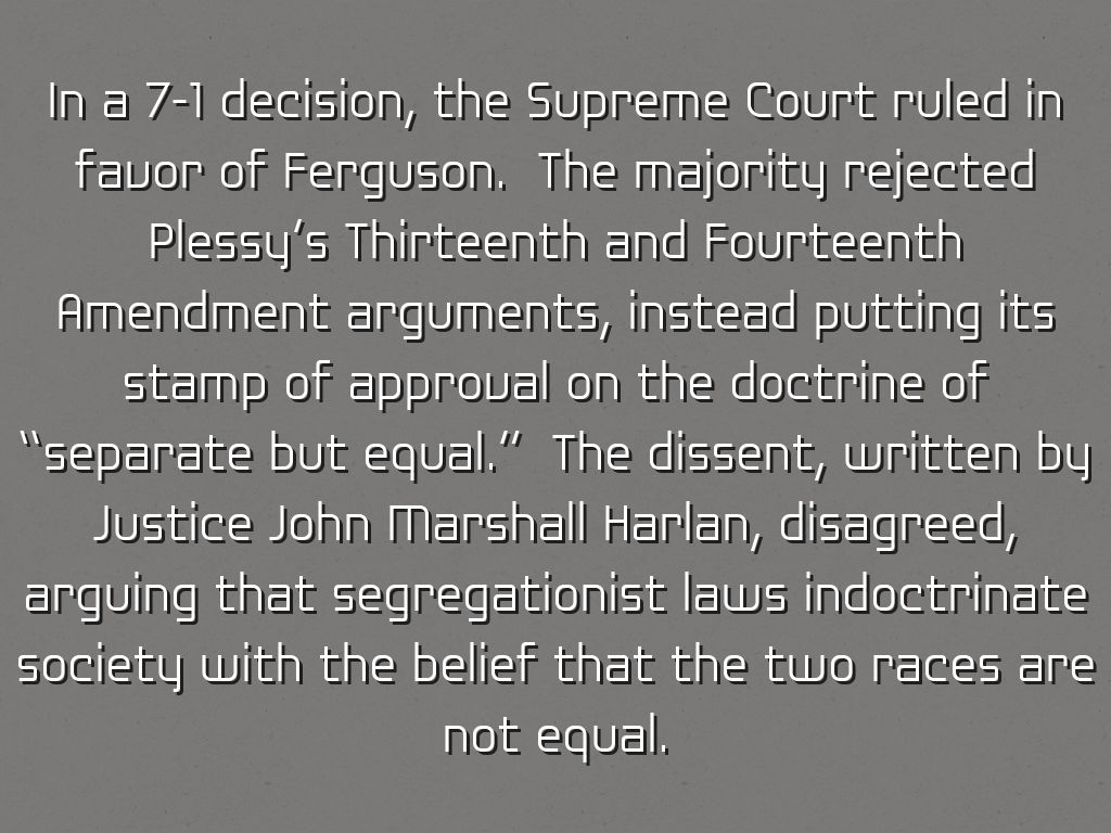 In a 7-1 decision, the Supreme Court ruled in favor of Ferguson. The majority rejected Plessy’s Thirteenth and Fourteenth Amendment arguments, instead putting its stamp of approval on the doctrine of “separate but equal.” The dissent, written by Justice John Marshall Harlan, disagreed, arguing that segregationist laws indoctrinate society with the belief that the two races are not equal.
