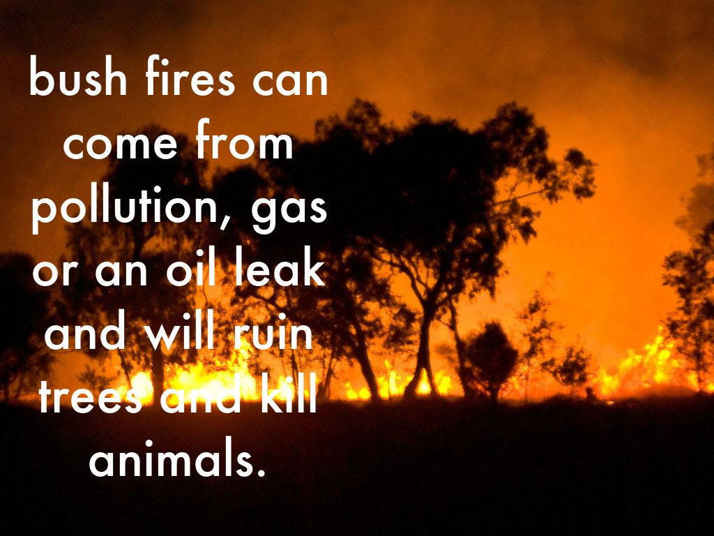 Bush fires can come from pollution, gas or an oil leak and will ruin trees and kill animals.