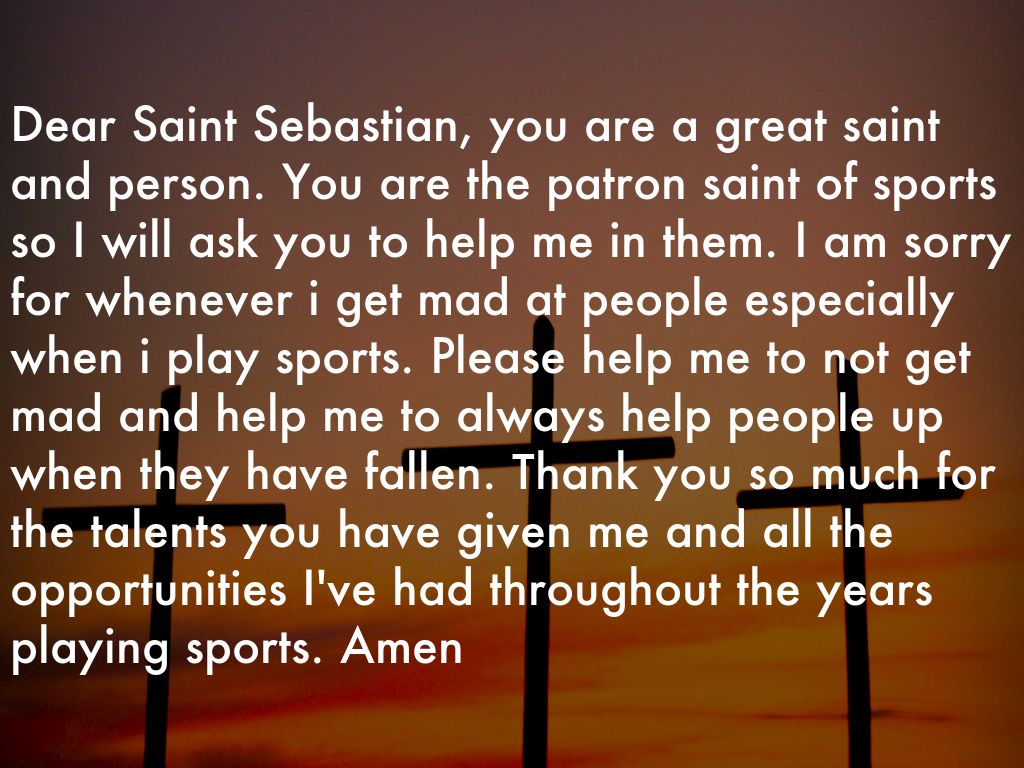 Dear Saint Sebastian, you are a great saint and person. You are the patron saint of sports so I will ask you to help me in them. I am sorry for whenever i get mad at people especially when i play sports. Please help me to not get mad and help me to always help people up when they have fallen. Thank you so much for the talents you have given me and all the opportunities I've had throughout the years playing sports. Amen