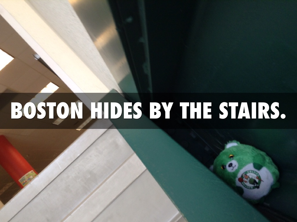 BOSTON HIDES BY THE STAIRS.