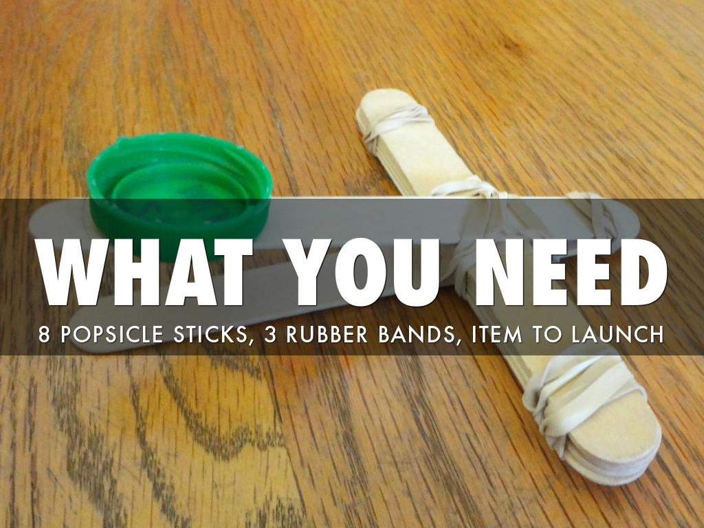 8 POPSICLE STICKS, 3 RUBBER BANDS, ITEM TO LAUNCH