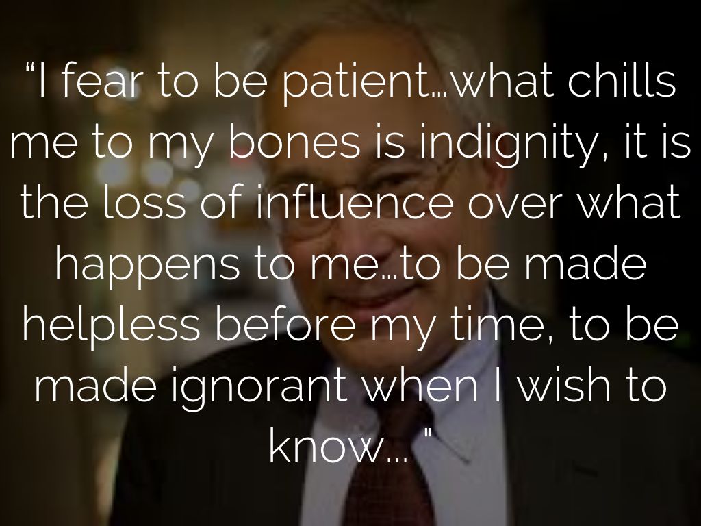 “I fear to be patient…what chills me to my bones is indignity, it is the loss of influence over what happens to me…to be made helpless before my time, to be made ignorant when I wish to know... "
