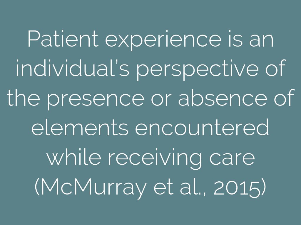 Patient experience is an individual’s perspective of the presence or absence of elements encountered while receiving care (McMurray et al., 2015)