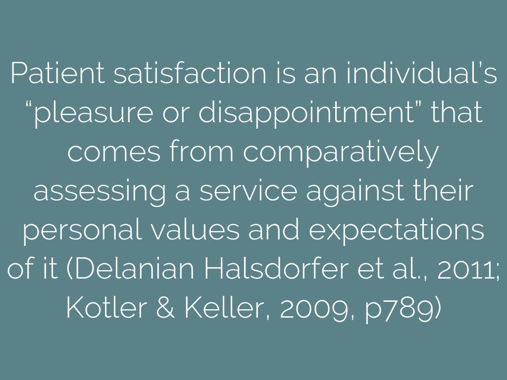 Patient satisfaction is an individual’s “pleasure or disappointment” that comes from comparatively assessing a service against their personal values and expectations of it (Delanian Halsdorfer et al., 2011; Kotler & Keller, 2009, p789)