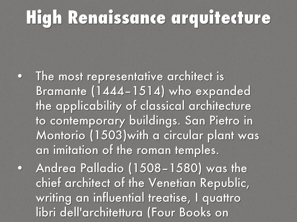 The most representative architect is Bramante (1444–1514) who expanded the applicability of classical architecture to contemporary buildings. San Pietro in Montorio (1503)with a circular plant was an imitation of the roman temples.