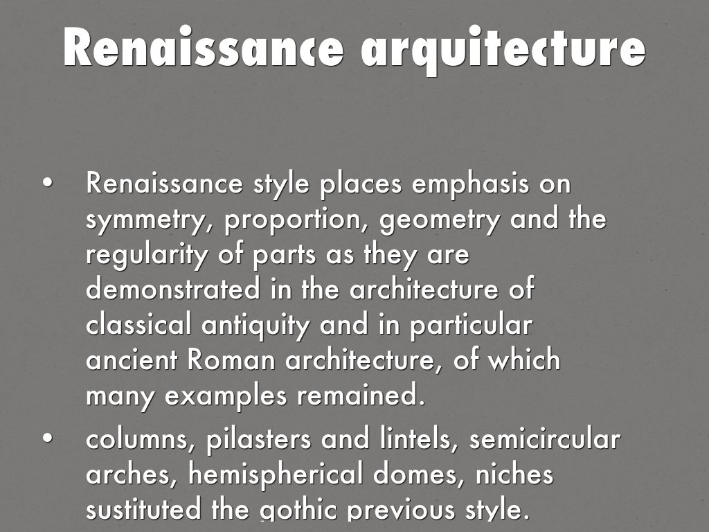 Renaissance style places emphasis on symmetry, proportion, geometry and the regularity of parts as they are demonstrated in the architecture of classical antiquity and in particular ancient Roman architecture, of which many examples remained.