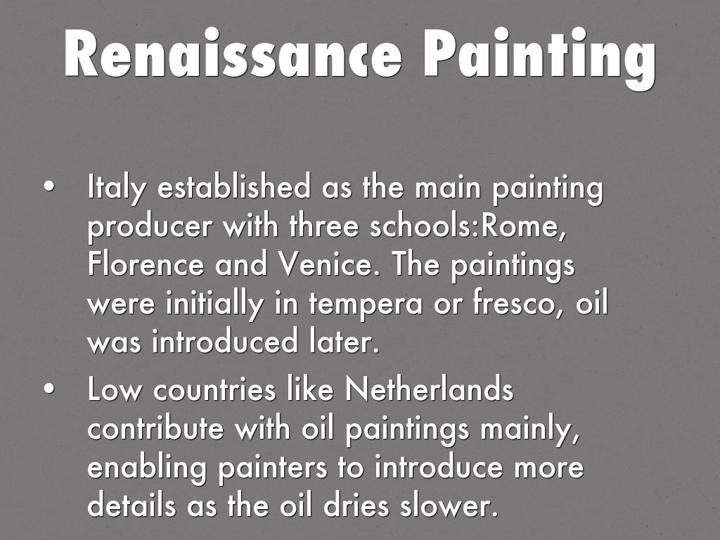 Italy established as the main painting producer with three schools:Rome, Florence and Venice. The paintings were initially in tempera or fresco, oil was introduced later.