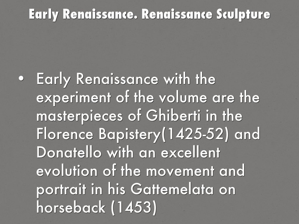 Early Renaissance with the experiment of the volume are the masterpieces of Ghiberti in the Florence Bapistery(1425-52) and Donatello with an excellent evolution of the movement and portrait in his Gattemelata on horseback (1453)