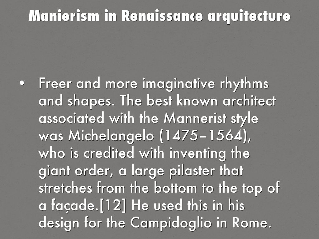 Freer and more imaginative rhythms and shapes. The best known architect associated with the Mannerist style was Michelangelo (1475–1564), who is credited with inventing the giant order, a large pilaster that stretches from the bottom to the top of a façade.[12] He used this in his design for the Campidoglio in Rome.