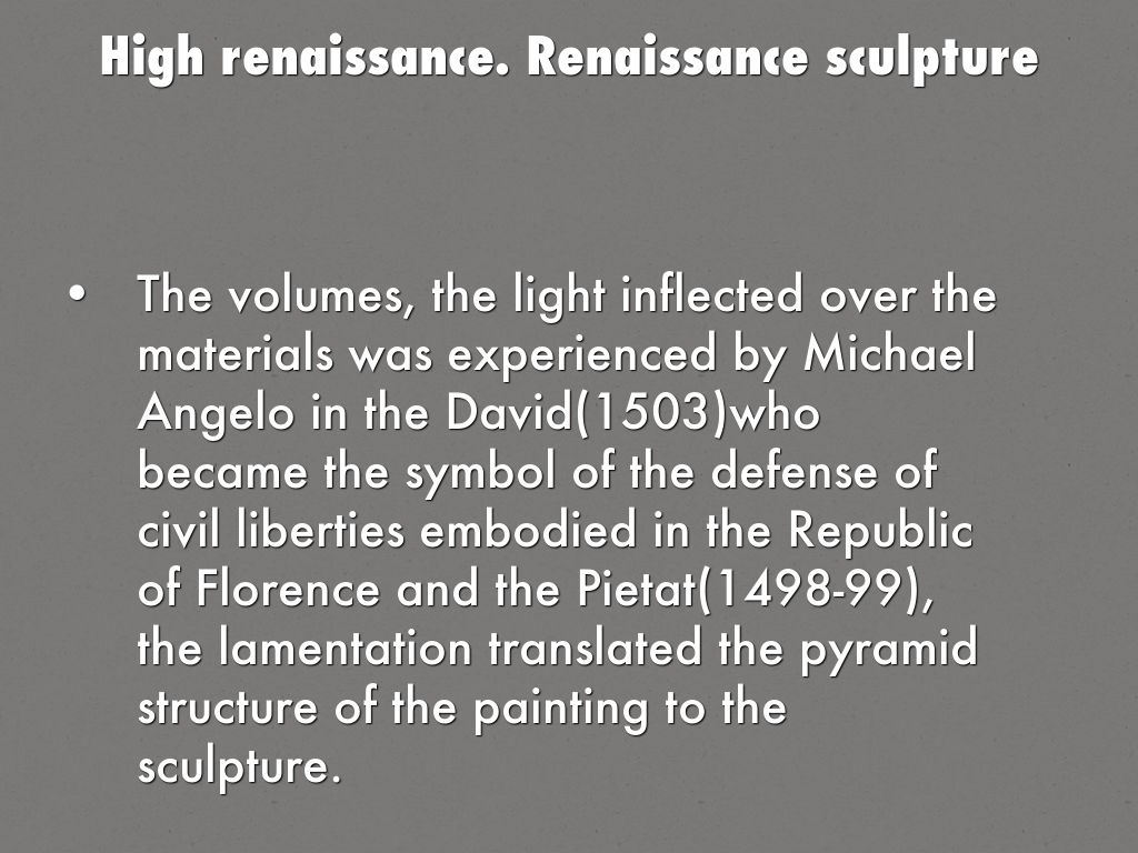 The volumes, the light inflected over the materials was experienced by Michael Angelo in the David(1503)who became the symbol of the defense of civil liberties embodied in the Republic of Florence and the Pietat(1498-99), the lamentation translated the pyramid structure of the painting to the sculpture.