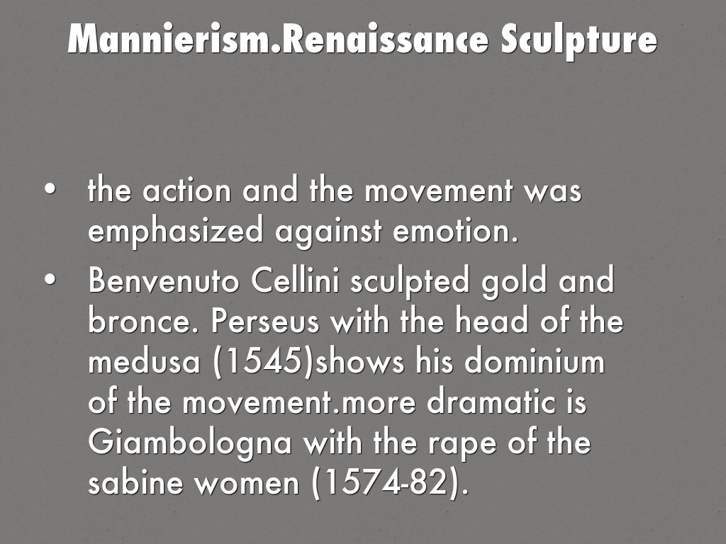 Benvenuto Cellini sculpted gold and bronce. Perseus with the head of the medusa (1545)shows his dominium of the movement.more dramatic is Giambologna with the rape of the sabine women (1574-82).