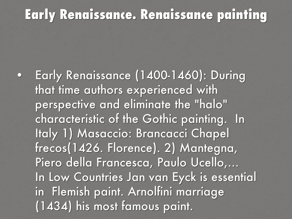 Early Renaissance (1400-1460): During that time authors experienced with perspective and eliminate the "halo" characteristic of the Gothic painting. In Italy 1) Masaccio: Brancacci Chapel frecos(1426. Florence). 2) Mantegna, Piero della Francesca, Paulo Ucello,... In Low Countries Jan van Eyck is essential in Flemish paint. Arnolfini marriage (1434) his most famous paint.