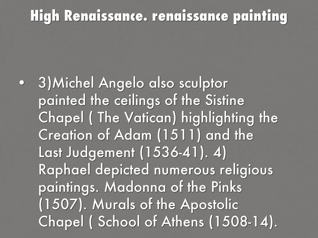 3)Michel Angelo also sculptor painted the ceilings of the Sistine Chapel ( The Vatican) highlighting the Creation of Adam (1511) and the Last Judgement (1536-41). 4) Raphael depicted numerous religious paintings. Madonna of the Pinks (1507). Murals of the Apostolic Chapel ( School of Athens (1508-14).