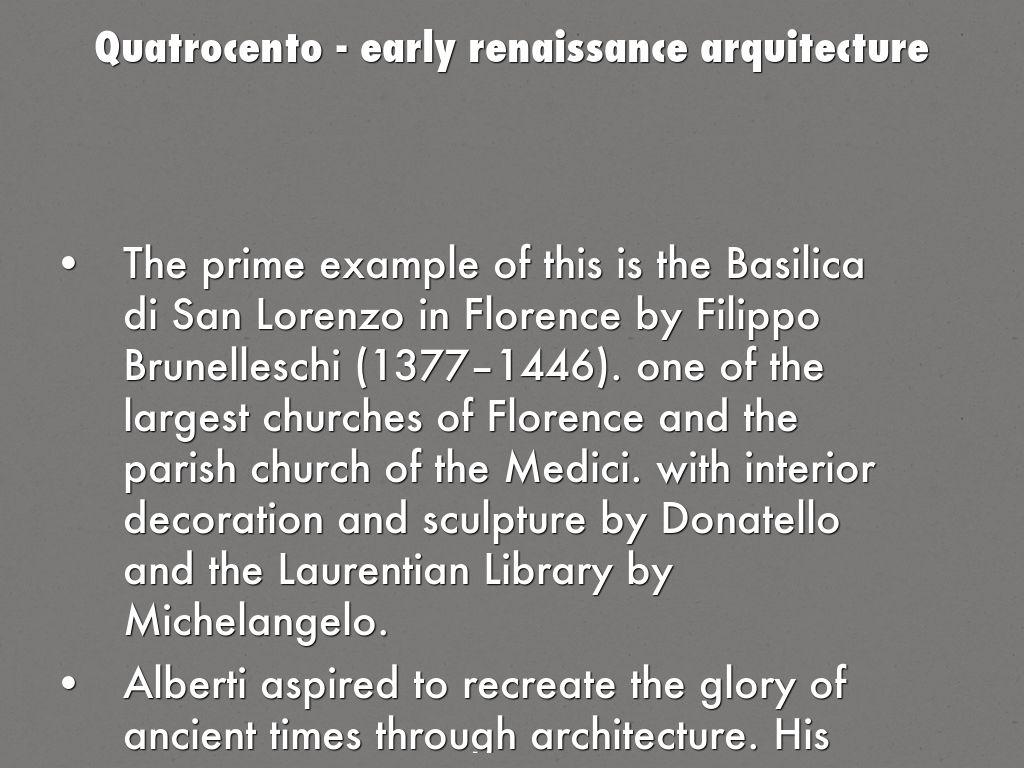 The prime example of this is the Basilica di San Lorenzo in Florence by Filippo Brunelleschi (1377–1446). one of the largest churches of Florence and the parish church of the Medici. with interior decoration and sculpture by Donatello and the Laurentian Library by Michelangelo.