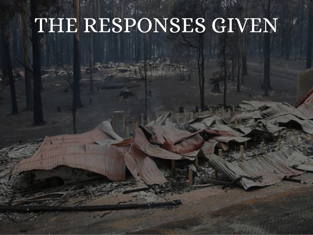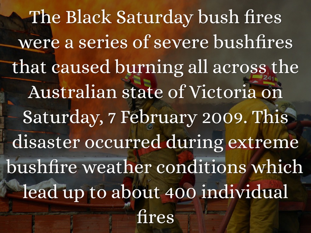 The Black Saturday bush fires were a series of severe bushfires that caused burning all across the Australian state of Victoria on Saturday, 7 February 2009. This disaster occurred during extreme bushfire weather conditions which lead up to about 400 individual fires