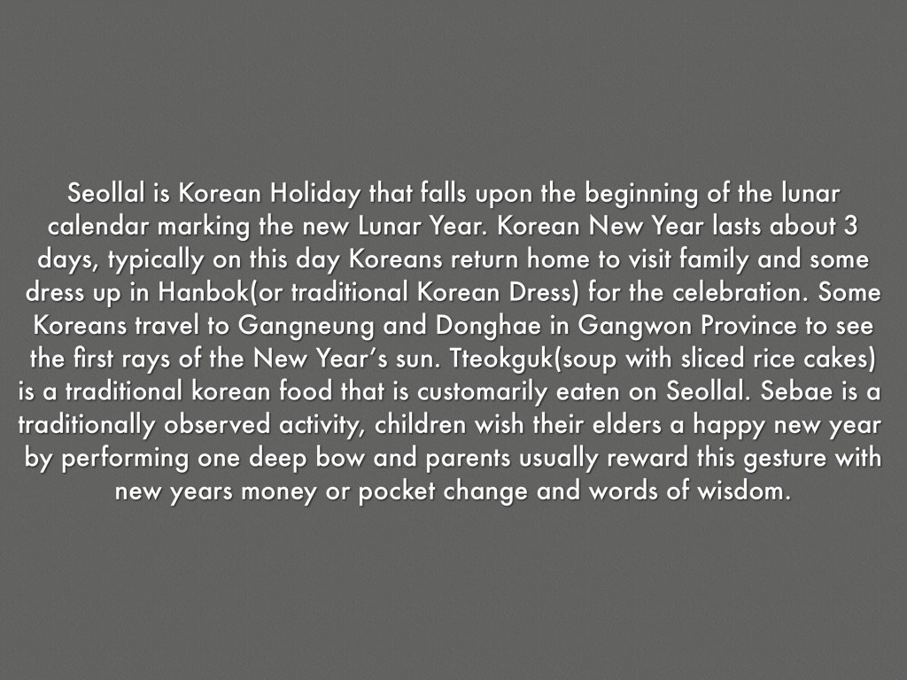 Seollal is Korean Holiday that falls upon the beginning of the lunar calendar marking the new Lunar Year. Korean New Year lasts about 3 days, typically on this day Koreans return home to visit family and some dress up in Hanbok(or traditional Korean Dress) for the celebration. Some Koreans travel to Gangneung and Donghae in Gangwon Province to see the first rays of the New Year’s sun. Tteokguk(soup with sliced rice cakes) is a traditional korean food that is customarily eaten on Seollal. Sebae is a traditionally observed activity, children wish their elders a happy new year by performing one deep bow and parents usually reward this gesture with new years money or pocket change and words of wisdom.