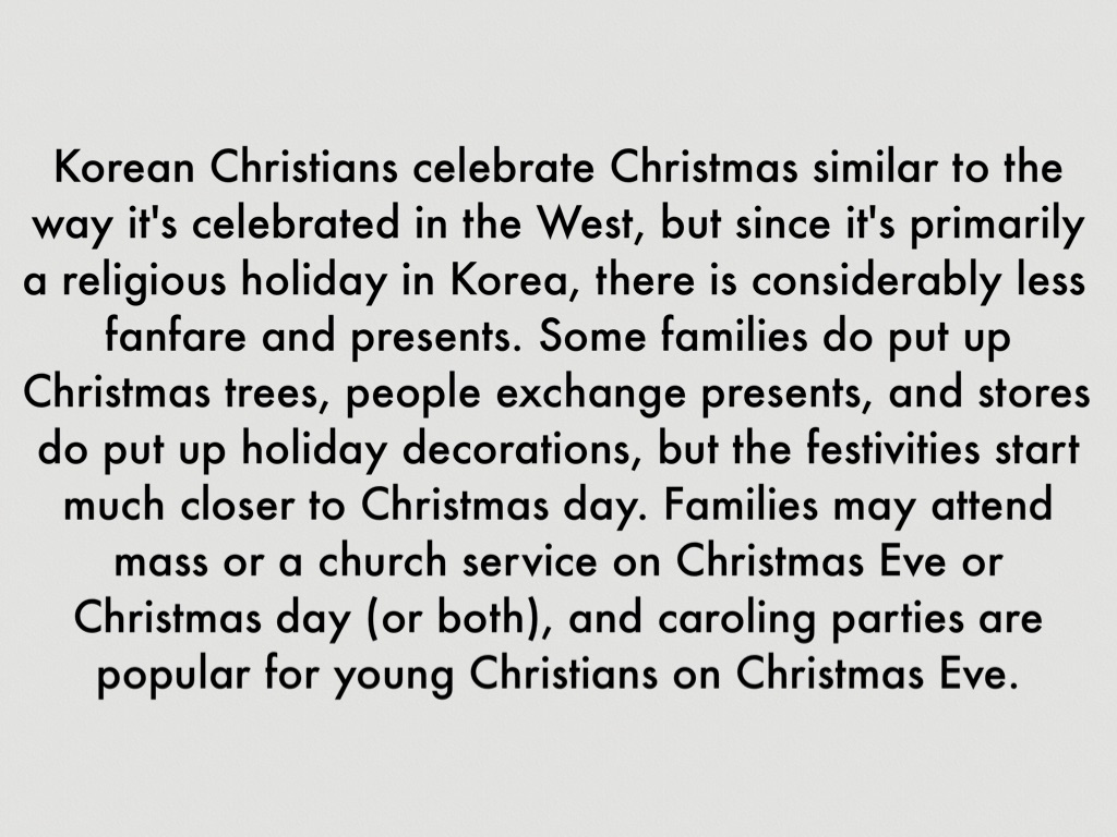 Korean Christians celebrate Christmas similar to the way it's celebrated in the West, but since it's primarily a religious holiday in Korea, there is considerably less fanfare and presents. Some families do put up Christmas trees, people exchange presents, and stores do put up holiday decorations, but the festivities start much closer to Christmas day. Families may attend mass or a church service on Christmas Eve or Christmas day (or both), and caroling parties are popular for young Christians on Christmas Eve.