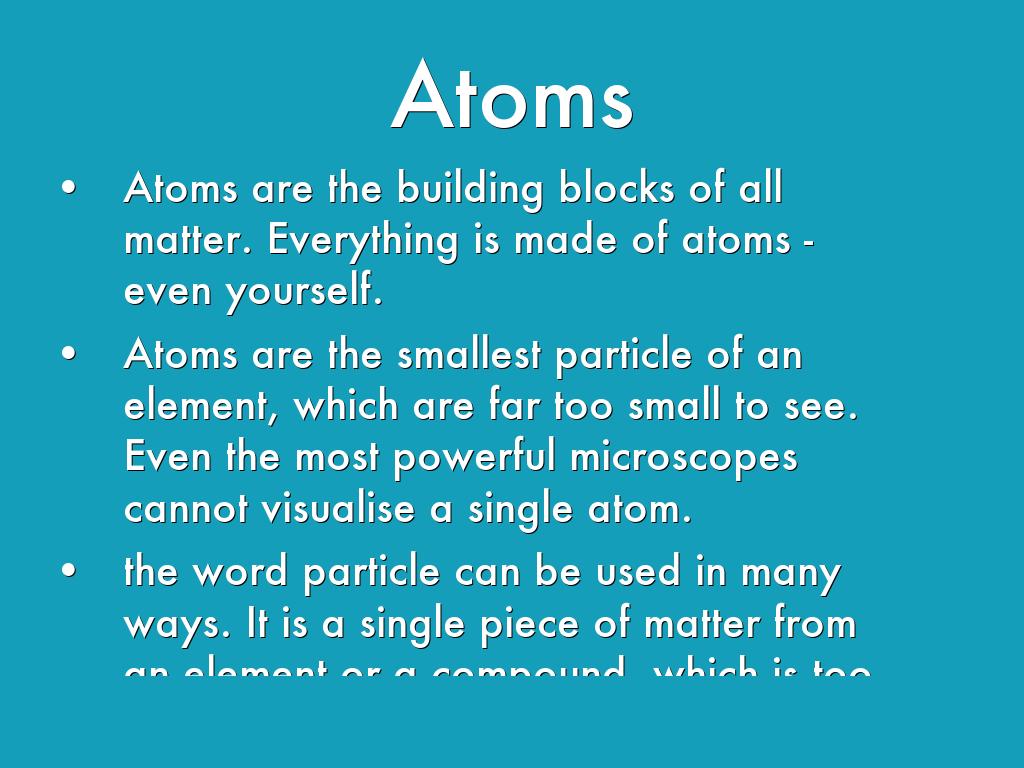 Atoms are the building blocks of all matter. Everything is made of atoms - even yourself.