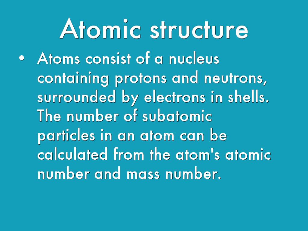 Atoms consist of a nucleus containing protons and neutrons, surrounded by electrons in shells. The number of subatomic particles in an atom can be calculated from the atom's atomic number and mass number.