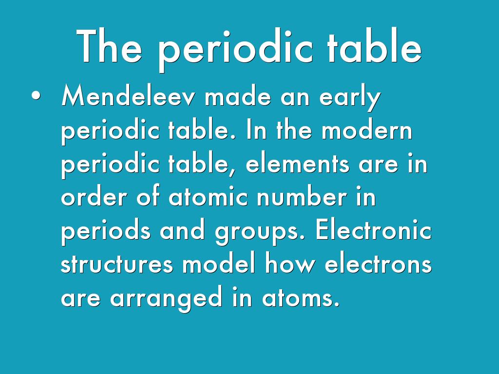 Mendeleev made an early periodic table. In the modern periodic table, elements are in order of atomic number in periods and groups. Electronic structures model how electrons are arranged in atoms.