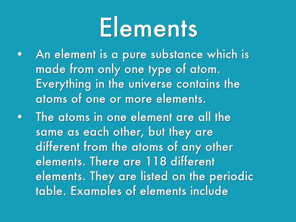The atoms in one element are all the same as each other, but they are different from the atoms of any other elements. There are 118 different elements. They are listed on the periodic table. Examples of elements include oxygen, hydrogen and carbon.