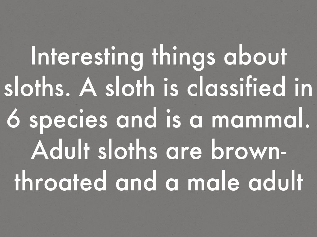 Interesting things about sloths. A sloth is classified in 6 species and is a mammal. Adult sloths are brown-throated and adult male sloths are pale-throated.