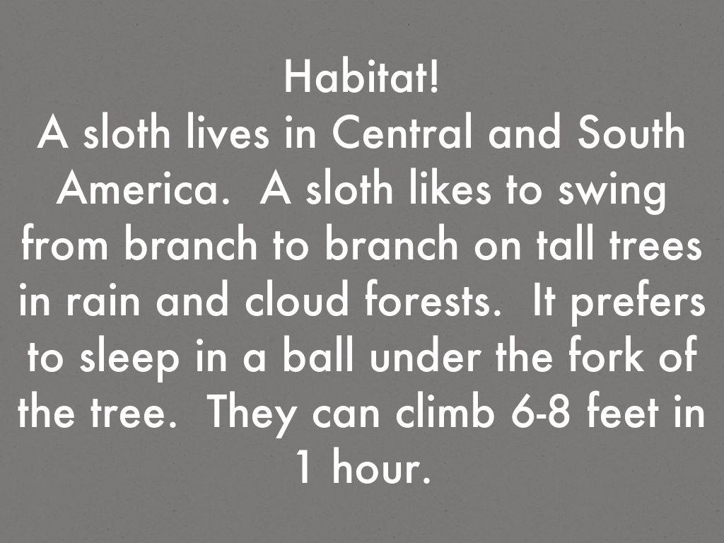 Habitat! A sloth lives in Central and South America. A sloth likes to swing from branch to branch on tall trees in rain and cloud forests. It prefers to sleep in a ball under the fork of the tree. They can climb 6-8 feet in 1 hour.