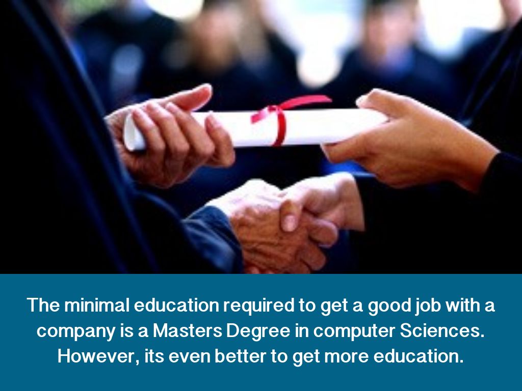 The minimal education required to get a good job with a company is a Masters Degree in computer Sciences. However, its even better to get more education.