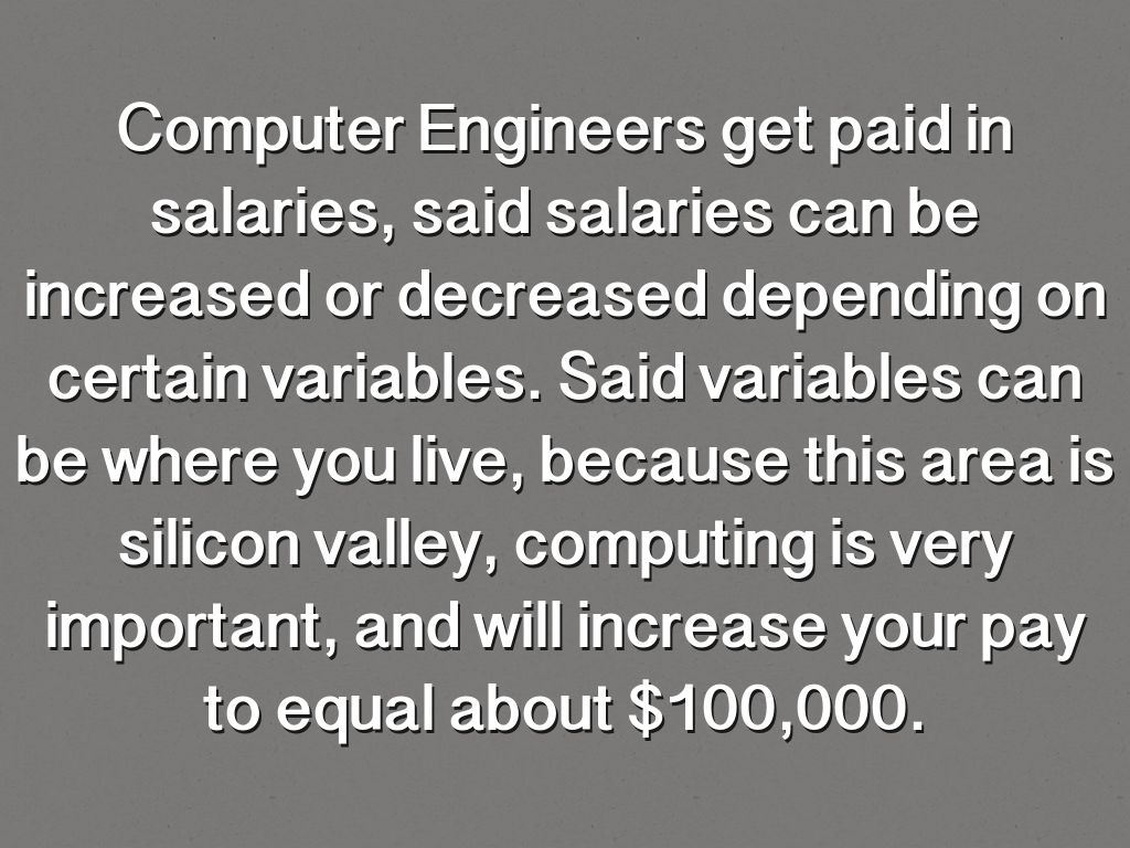 Computer Engineers get paid in salaries, said salaries can be increased or decreased depending on certain variables. Said variables can be where you live, because this area is silicon valley, computing is very important, and will increase your pay to equal about $100,000.