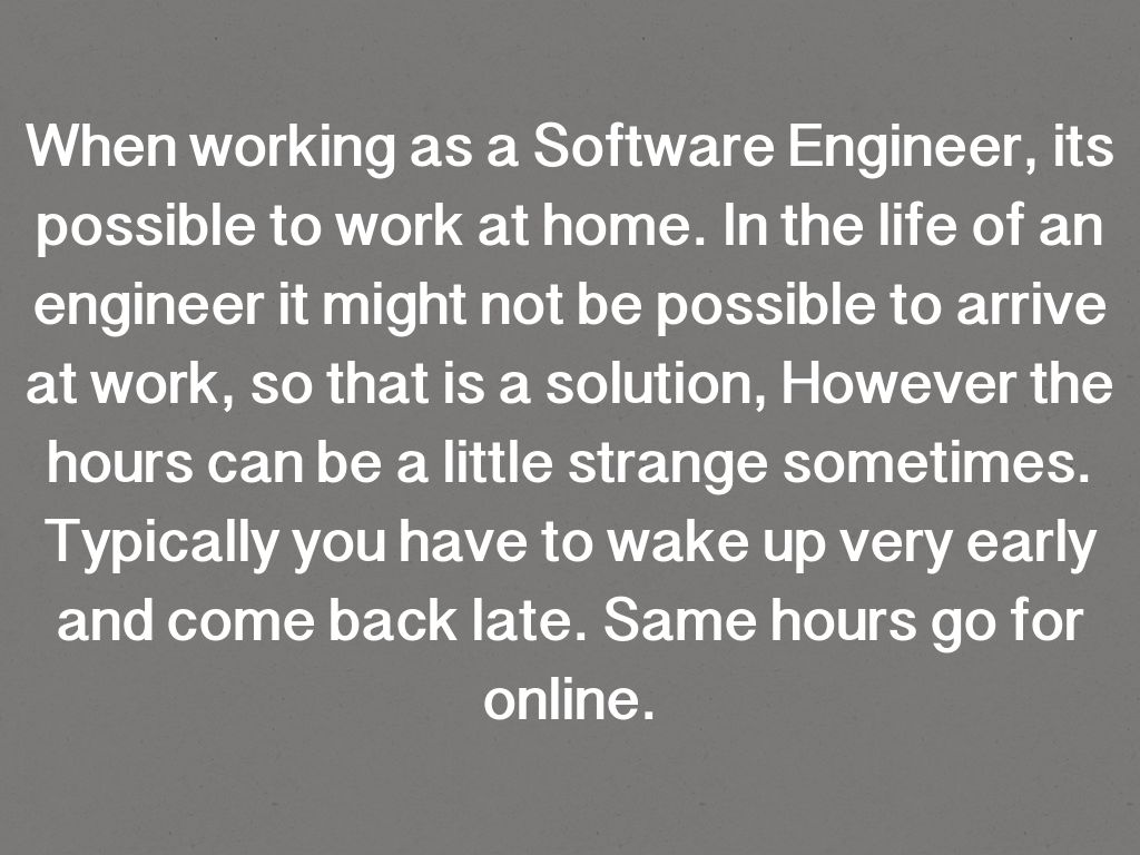 When working as a Software Engineer, its possible to work at home. In the life of an engineer it might not be possible to arrive at work, so that is a solution, However the hours can be a little strange sometimes. Typically you have to wake up very early and come back late. Same hours go for online.