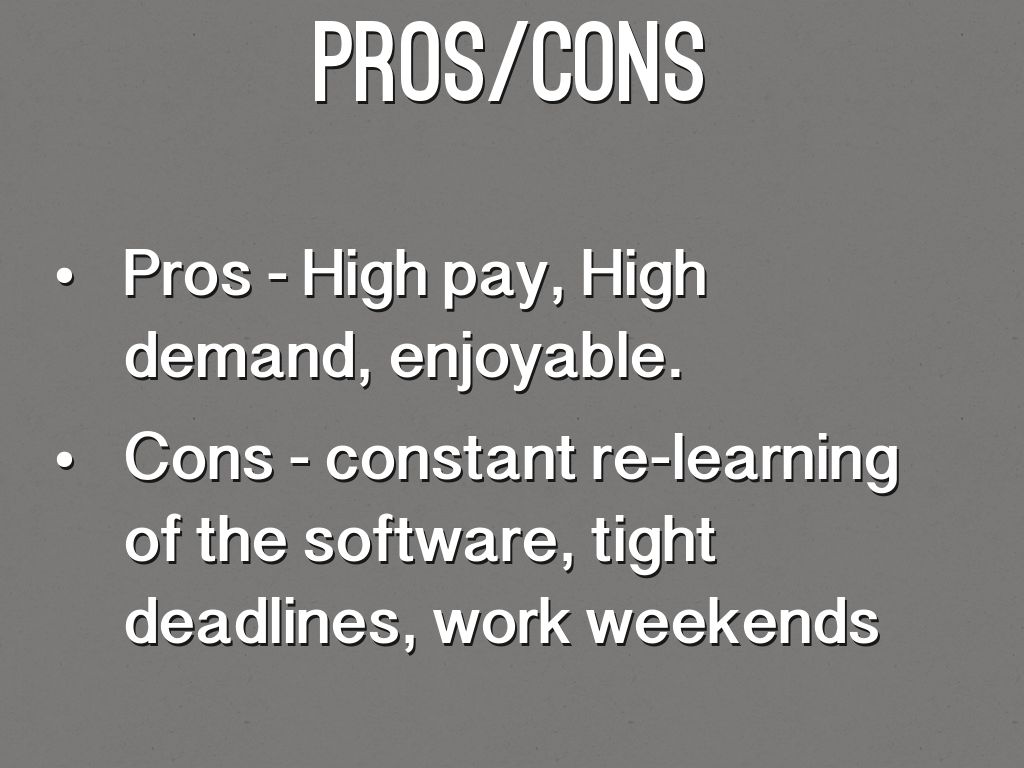 - Cons - constant re-learning of the software, tight deadlines, work weekends