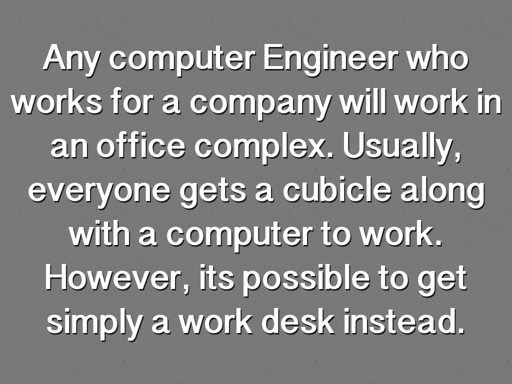 Any computer Engineer who works for a company will work in an office complex. Usually, everyone gets a cubicle along with a computer to work. However, its possible to get simply a work desk instead.