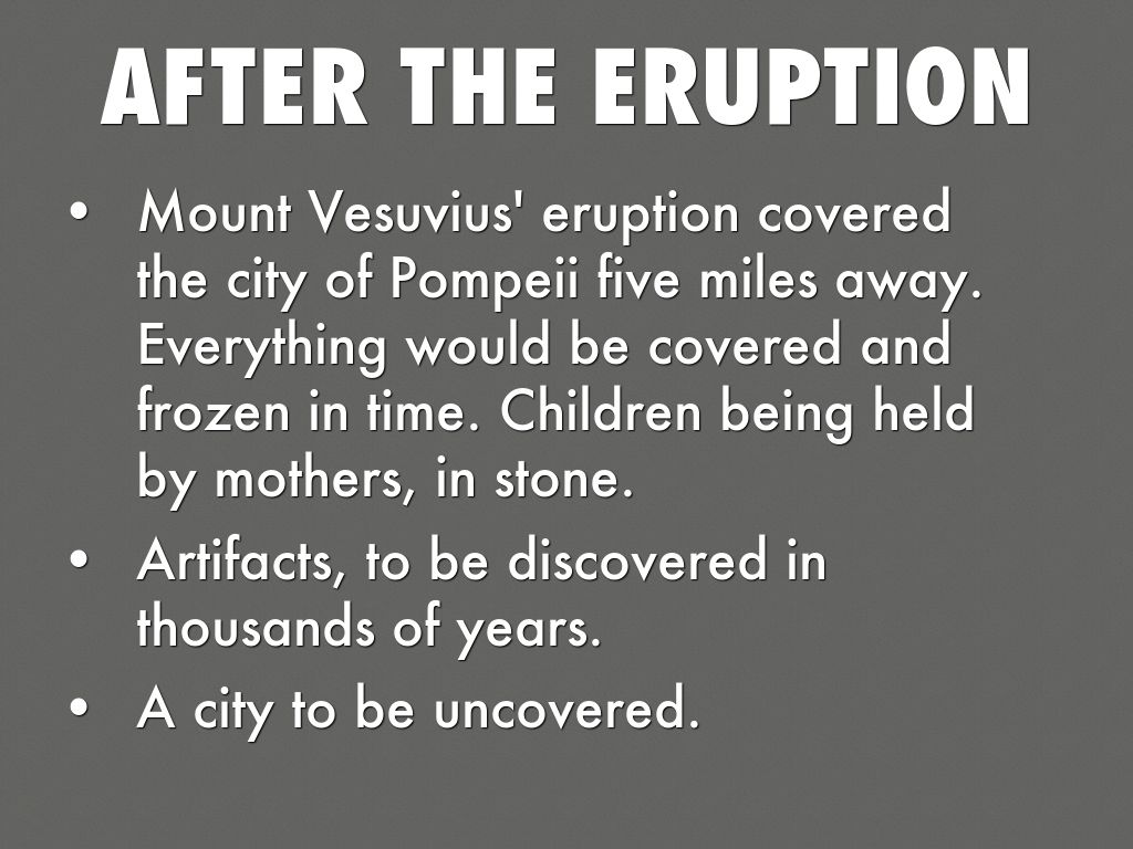 Mount Vesuvius' eruption covered the city of Pompeii five miles away. Everything would be covered and frozen in time. Children being held by mothers, in stone.