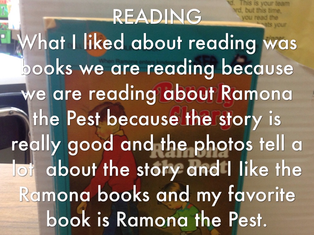 What I liked about reading was books we are reading because we are reading about Ramona the Pest because the story is really good and the photos tell a lot about the story and I Iike the Ramona books and my favorite book is Ramona the Pest.
