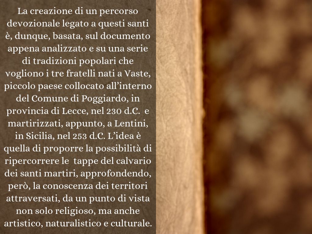 La creazione di un percorso devozionale legato a questi santi è, dunque, basata, sul documento appena analizzato e su una serie di tradizioni popolari che vogliono i tre fratelli nati a Vaste, piccolo paese collocato all’interno del Comune di Poggiardo, in provincia di Lecce, nel 230 d.C. e martirizzati, appunto, a Lentini, in Sicilia, nel 253 d.C. L’idea è quella di proporre la possibilità di ripercorrere le tappe del calvario dei santi martiri, approfondendo, però, la conoscenza dei territori attraversati, da un punto di vista non solo religioso, ma anche artistico, naturalistico e culturale.