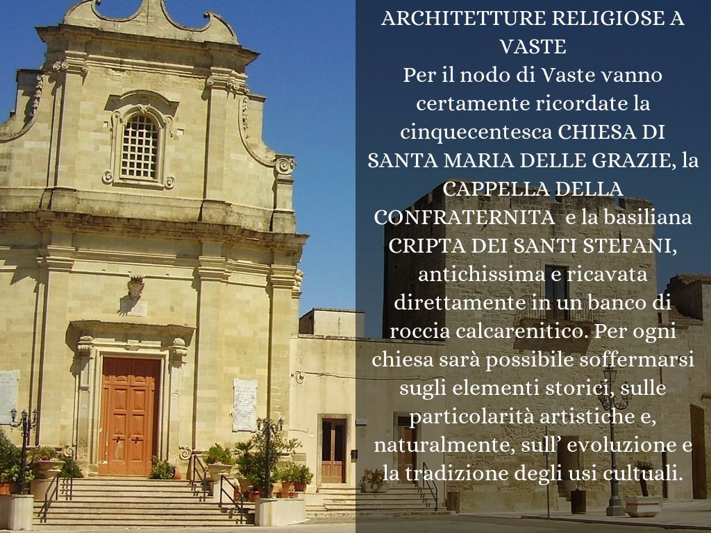 Per il nodo di Vaste vanno certamente ricordate la cinquecentesca CHIESA DI SANTA MARIA DELLE GRAZIE, la CAPPELLA DELLA CONFRATERNITA e la basiliana CRIPTA DEI SANTI STEFANI, antichissima e ricavata direttamente in un banco di roccia calcarenitico. Per ogni chiesa sarà possibile soffermarsi sugli elementi storici, sulle particolarità artistiche e, naturalmente, sull’ evoluzione e la tradizione degli usi cultuali.
