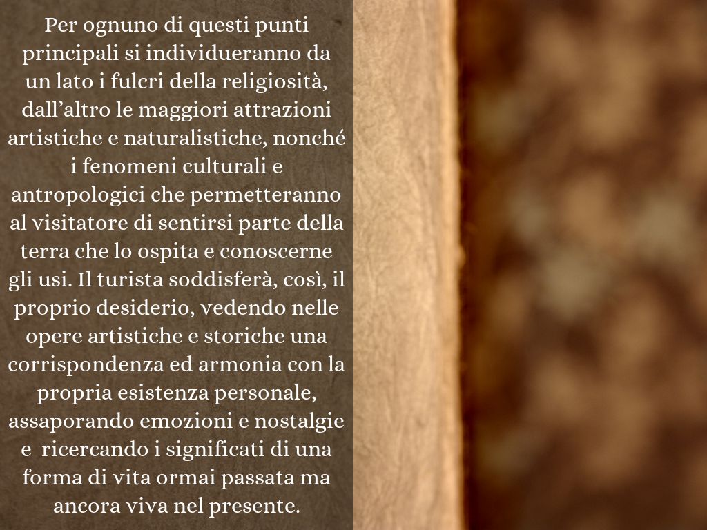 Per ognuno di questi punti principali si individueranno da un lato i fulcri della religiosità, dall’altro le maggiori attrazioni artistiche e naturalistiche, nonché i fenomeni culturali e antropologici che permetteranno al visitatore di sentirsi parte della terra che lo ospita e conoscerne gli usi. Il turista soddisferà, così, il proprio desiderio, vedendo nelle opere artistiche e storiche una corrispondenza ed armonia con la propria esistenza personale, assaporando emozioni e nostalgie e ricercando i significati di una forma di vita ormai passata ma ancora viva nel presente.