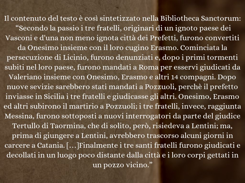 Il contenuto del testo è così sintetizzato nella Bibliotheca Sanctorum: “Secondo la passio i tre fratelli, originari di un ignoto paese dei Vasconi e d'una non meno ignota città dei Prefetti, furono convertiti da Onesimo insieme con il loro cugino Erasmo. Cominciata la persecuzione di Licinio, furono denunziati e, dopo i primi tormenti subiti nel loro paese, furono mandati a Roma per esservi giudicati da Valeriano insieme con Onesimo, Erasmo e altri 14 compagni. Dopo nuove sevizie sarebbero stati mandati a Pozzuoli, perchè il prefetto inviasse in Sicilia i tre fratelli e giudicasse gli altri. Onesimo, Erasmo ed altri subirono il martirio a Pozzuoli; i tre fratelli, invece, raggiunta Messina, furono sottoposti a nuovi interrogatori da parte del giudice Tertullo di Taormina, che di solito, però, risiedeva a Lentini; ma, prima di giungere a Lentini, avrebbero trascorso alcuni giorni in carcere a Catania. […]Finalmente i tre santi fratelli furono giudicati e decollati in un luogo poco distante dalla città e i loro corpi gettati in un pozzo vicino.”