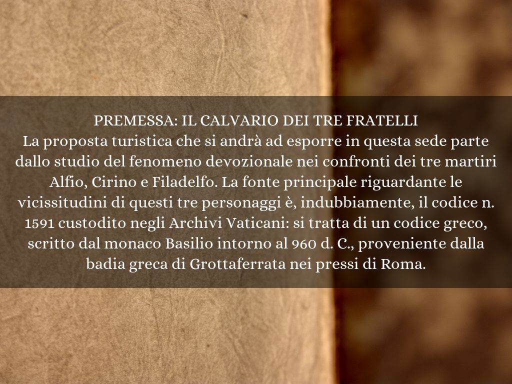 La proposta turistica che si andrà ad esporre in questa sede parte dallo studio del fenomeno devozionale nei confronti dei tre martiri Alfio, Cirino e Filadelfo. La fonte principale riguardante le vicissitudini di questi tre personaggi è, indubbiamente, il codice n. 1591 custodito negli Archivi Vaticani: si tratta di un codice greco, scritto dal monaco Basilio intorno al 960 d. C., proveniente dalla badia greca di Grottaferrata nei pressi di Roma.