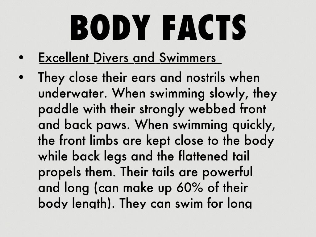 They close their ears and nostrils when underwater. When swimming slowly, they paddle with their strongly webbed front and back paws. When swimming quickly, the front limbs are kept close to the body while back legs and the flattened tail propels them. Their tails are powerful and long (can make up 60% of their body length). They can swim for long distances and stay underwater for 6-8 minutes with a single breath.