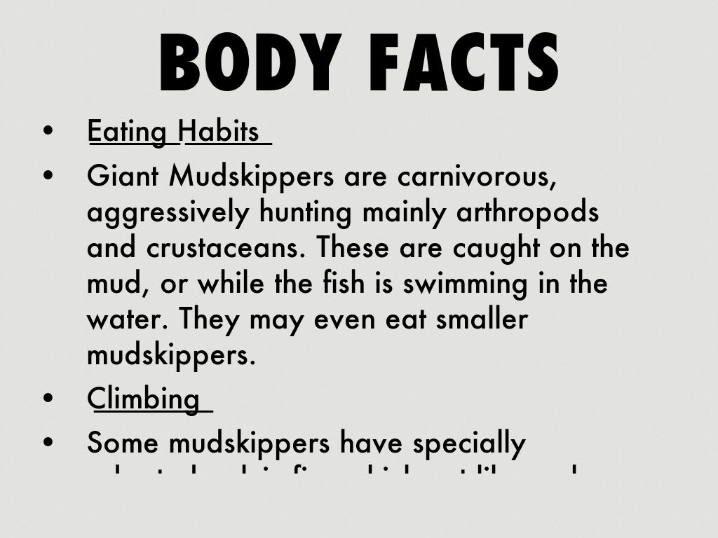 Giant Mudskippers are carnivorous, aggressively hunting mainly arthropods and crustaceans. These are caught on the mud, or while the fish is swimming in the water. They may even eat smaller mudskippers.