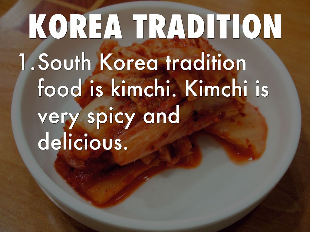 South Korea tradition food is kimchi. Kimchi is very spicy and delicious.