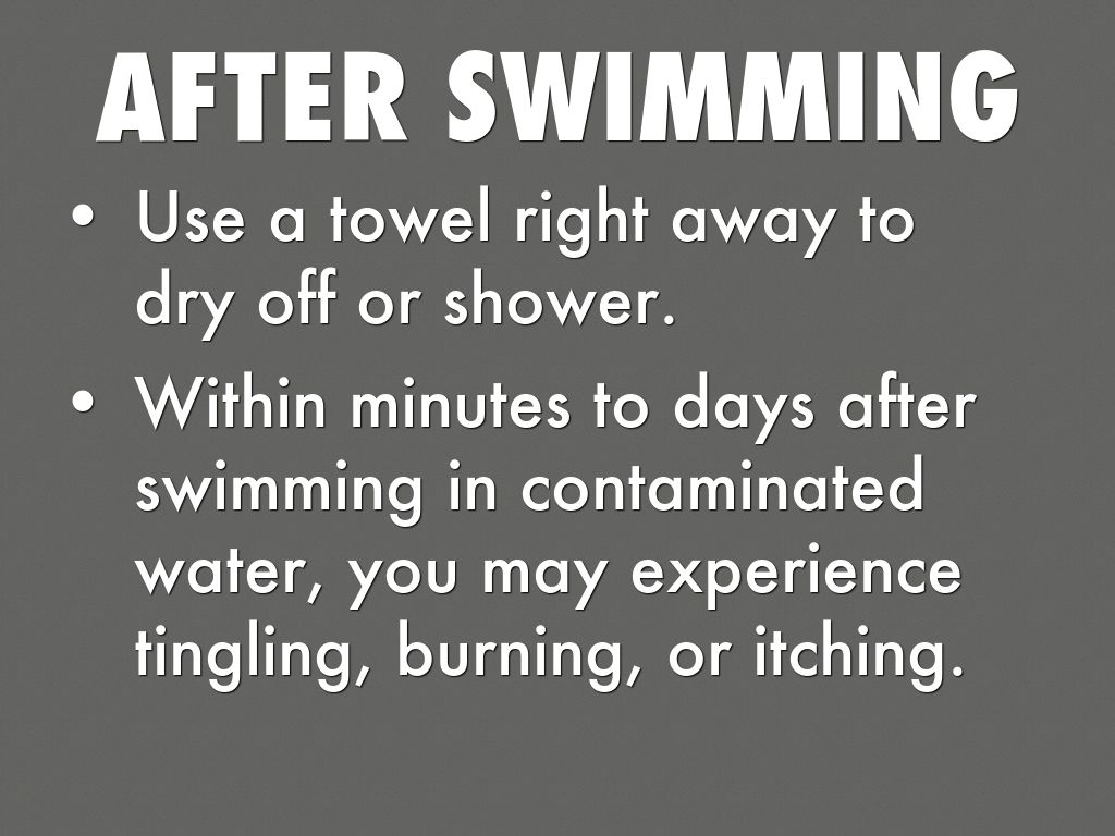 Within minutes to days after swimming in contaminated water, you may experience tingling, burning, or itching.