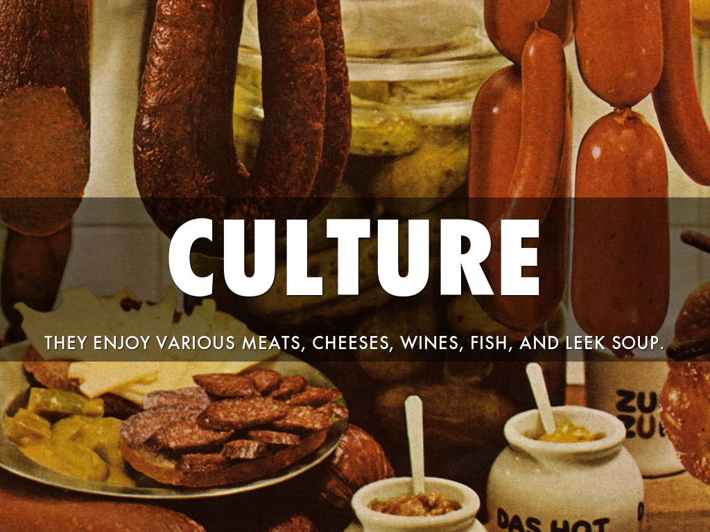 THEY ENJOY VARIOUS MEATS, CHEESES, WINES, FISH, AND LEEK SOUP.