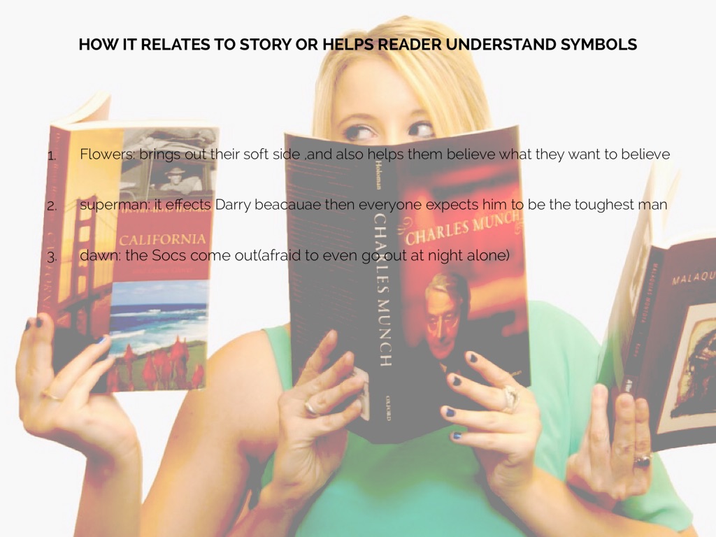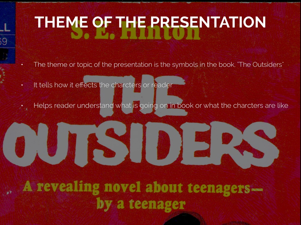 The theme or topic of the presentation is the symbols in the book, "The Outsiders"