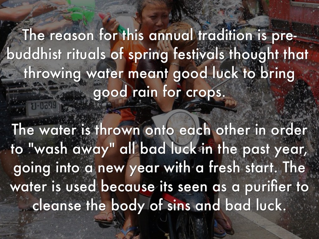 The reason for this annual tradition is pre-buddhist rituals of spring festivals thought that throwing water meant good luck to bring good rain for crops.