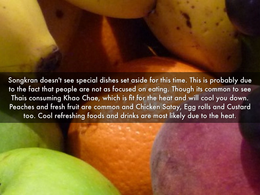 Songkran doesn't see special dishes set aside for this time. This is probably due to the fact that people are not as focused on eating. Though its common to see Thais consuming Khao Chae, which is fit for the heat and will cool you down. Peaches and fresh fruit are common and Chicken Satay, Egg rolls and Custard too. Cool refreshing foods and drinks are most likely due to the heat.
