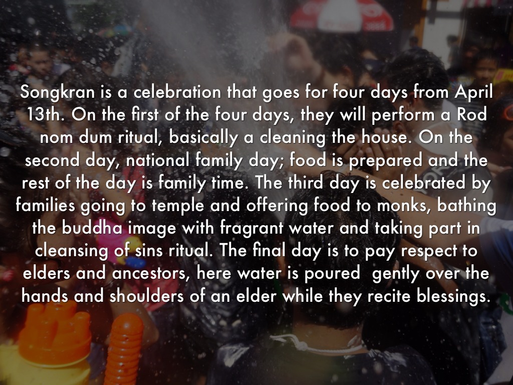 Songkran is a celebration that goes for four days from April 13th. On the first of the four days, they will perform a Rod nom dum ritual, basically a cleaning the house. On the second day, national family day; food is prepared and the rest of the day is family time. The third day is celebrated by families going to temple and offering food to monks, bathing the buddha image with fragrant water and taking part in cleansing of sins ritual. The final day is to pay respect to elders and ancestors, here water is poured gently over the hands and shoulders of an elder while they recite blessings.